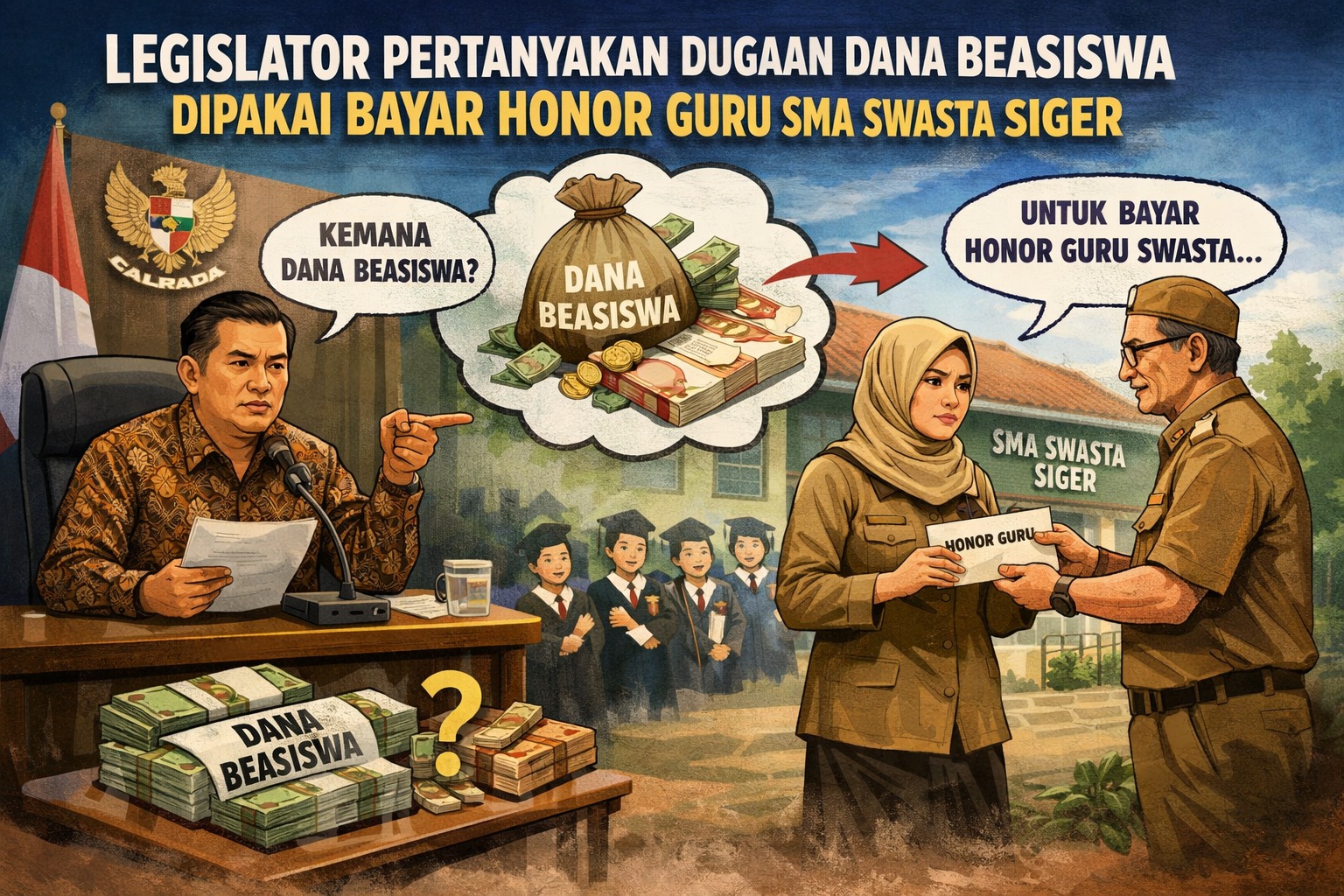 SKYSHI MEDIA- Sumber dana pembayaran honorarium tenaga pengajar SMA Swasta Siger Bandar Lampung menuai sorotan tajam. Seorang legislator DPRD secara terbuka mempertanyakan kemungkinan digunakannya anggaran beasiswa untuk membayar honor guru di sekolah swasta tersebut.